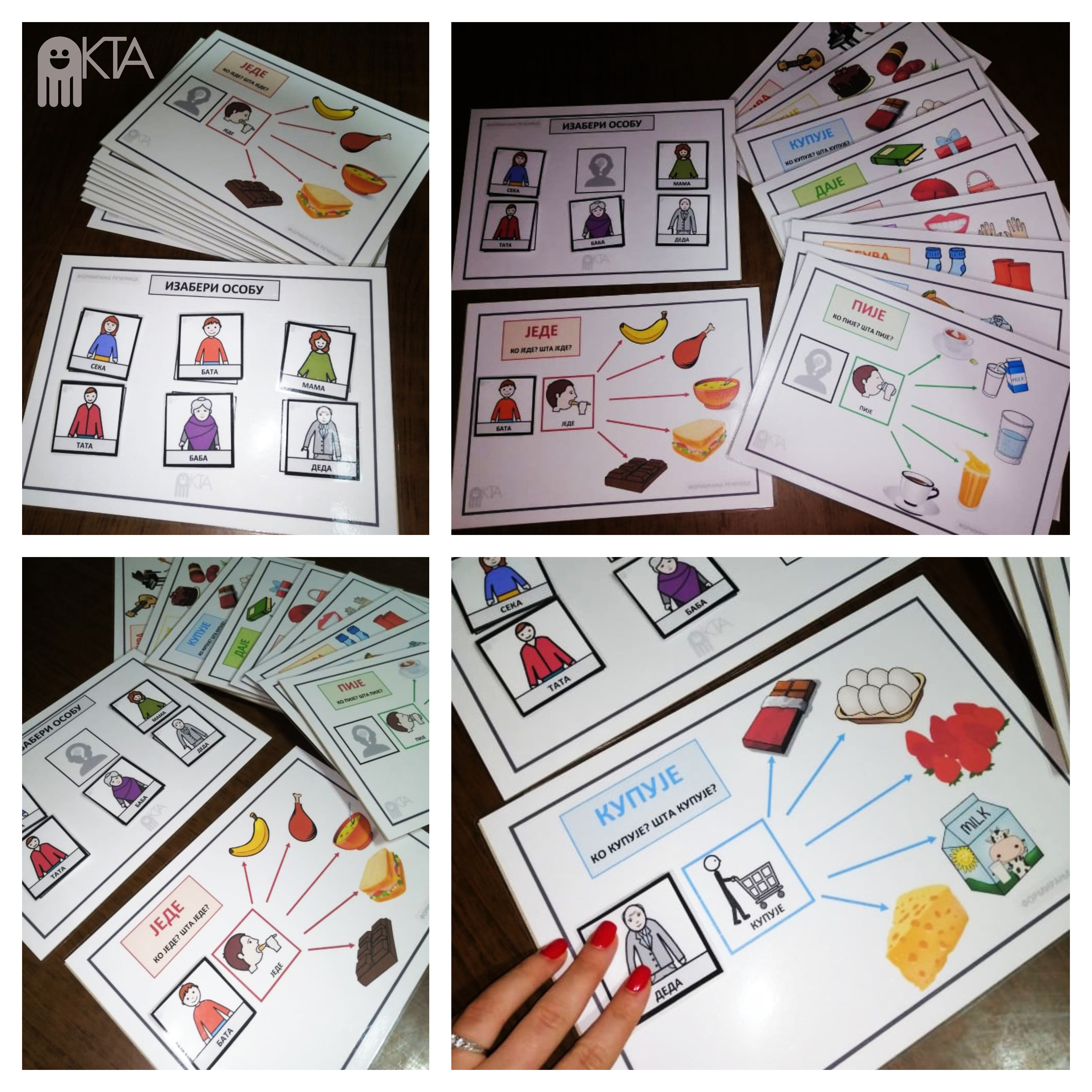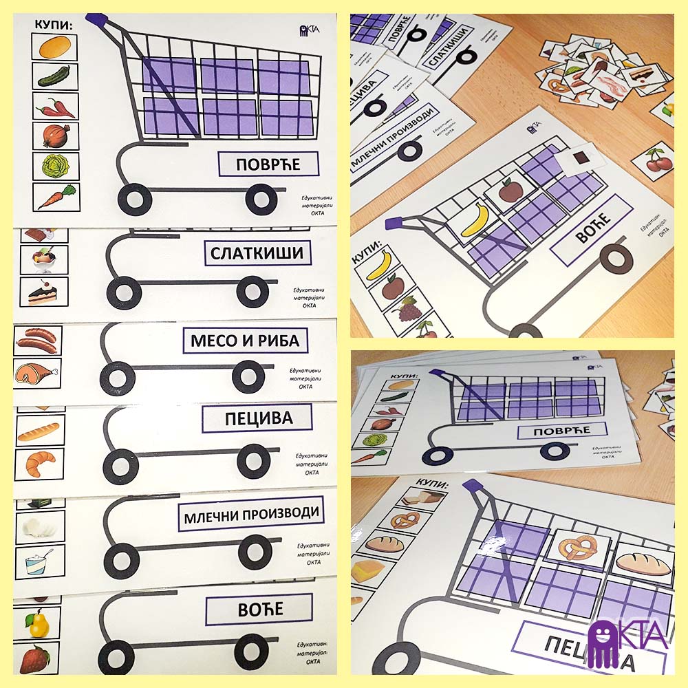 Praćenje vizuelnog spiska za kupovinu, vežbe klasifikovanja namirnica u kategorije (voće, povrće, meso, mlečni proizvodi, peciva i slatkiši), podsticanje pasivnog i aktivnog rečnika, koordinacija oko-ruka, podsticanje aktivnosti svakodnevnog života – odlazak u kupovinu. Opširnije