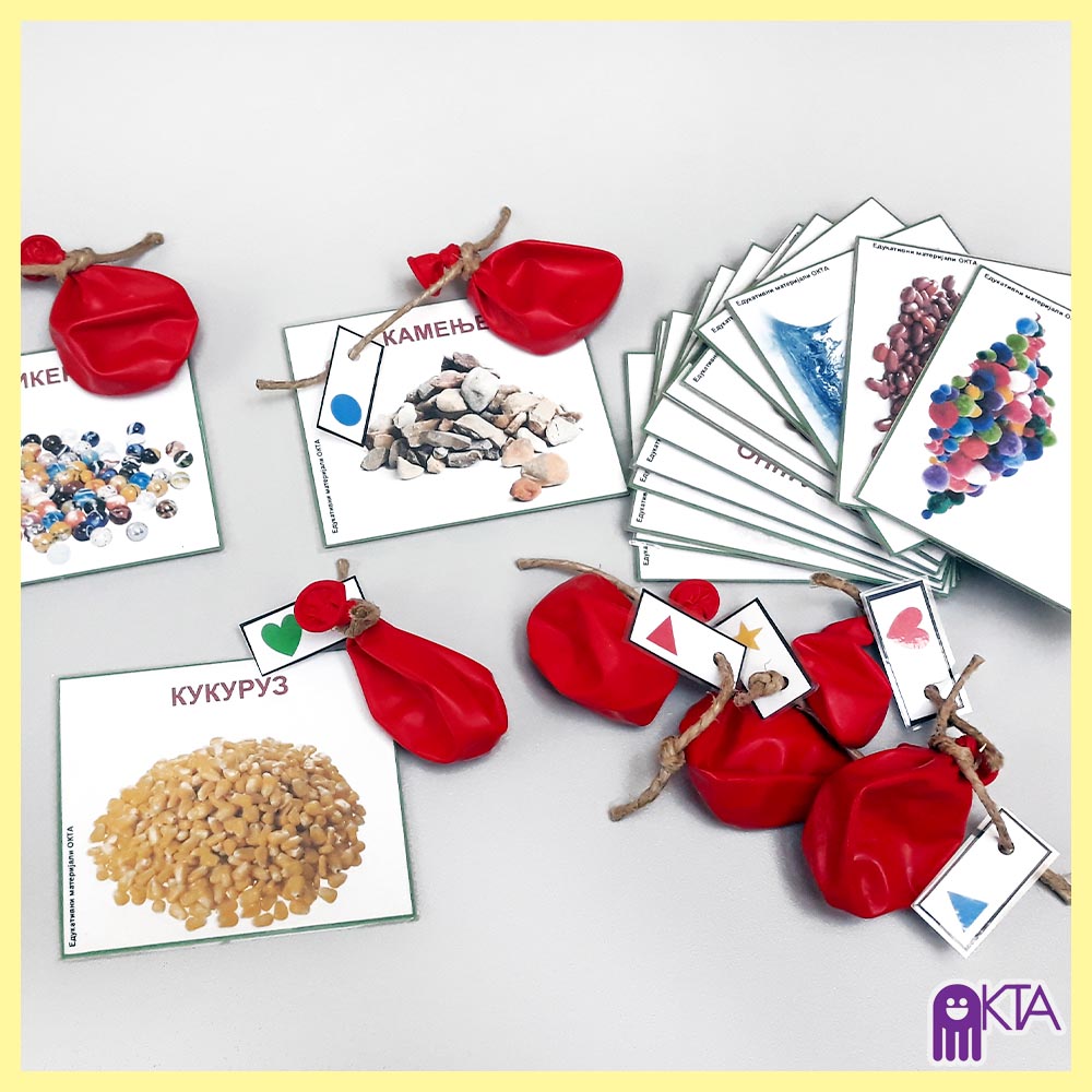14 balona sa oznakom, kartice sa oznakom (kontrola greške). Baloni su napunjeni brašnom, šećerom, kamenčićima, vatom, kukururom itd...