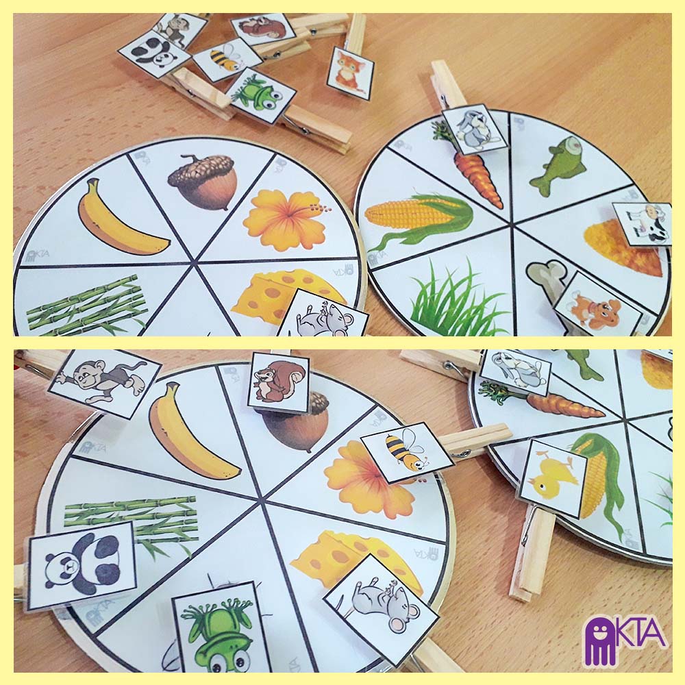 2 okrugla šablona ilustracijama hrane, ojačani lepenkom, 12 štipaljki sa karticama životinja.