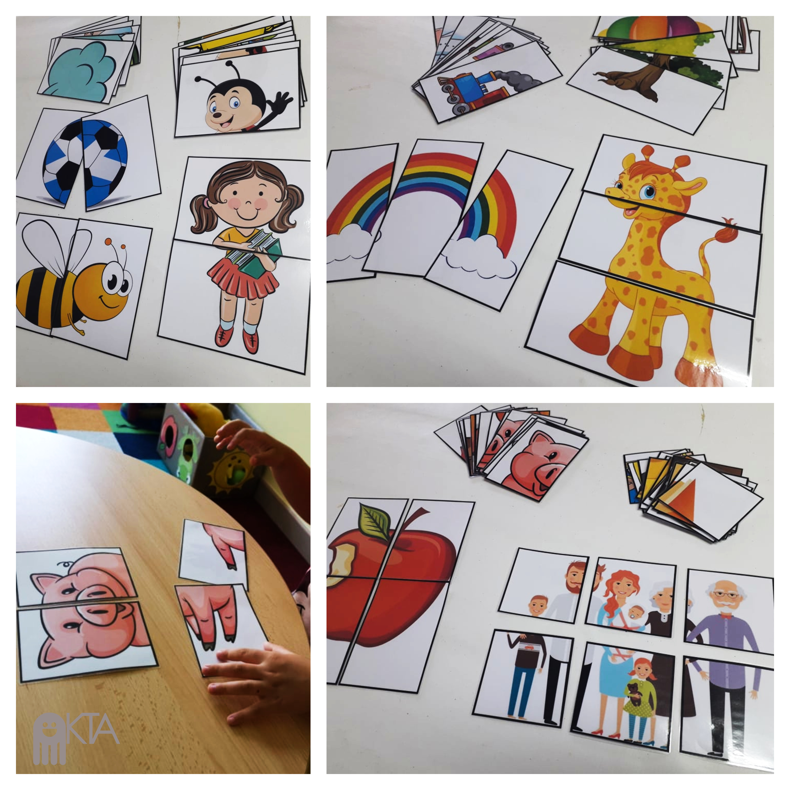 Plastificirane kartice različitih veličina – 5 slagalica iz dva dela – vertikalno, 5 slagalica iz dva dela – horizontalno, 5 slagalica iz tri dela – vertikalno, 5 slagalica iz tri dela – horizontalno, 5 slagalica iz četiri dela, 5 slagalica iz 6 delova. Svaka slagalica je A4 formata kada se sklopi.