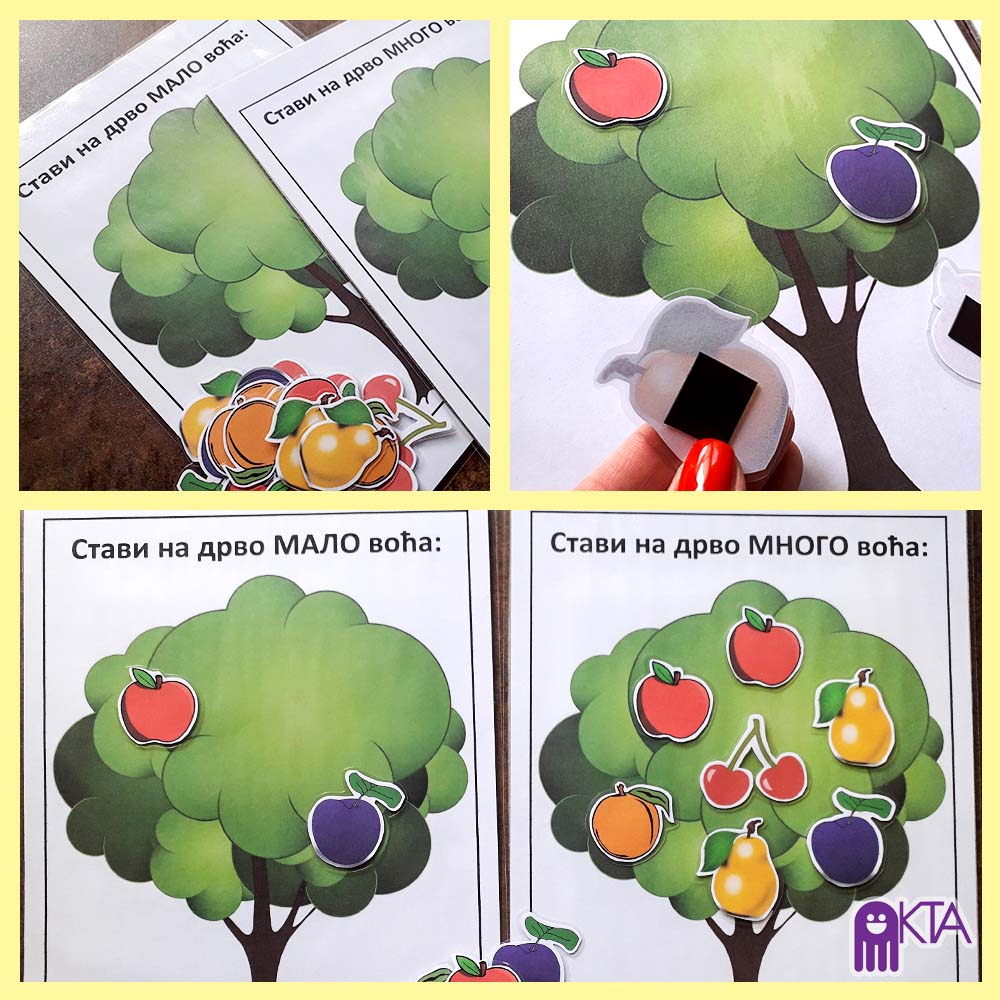 2 šablona A4 formata, sa magnetnom folijom, ojačana lepenkom; 25 plastificiranih kartica – voćkica, ojačanih lepenkom.