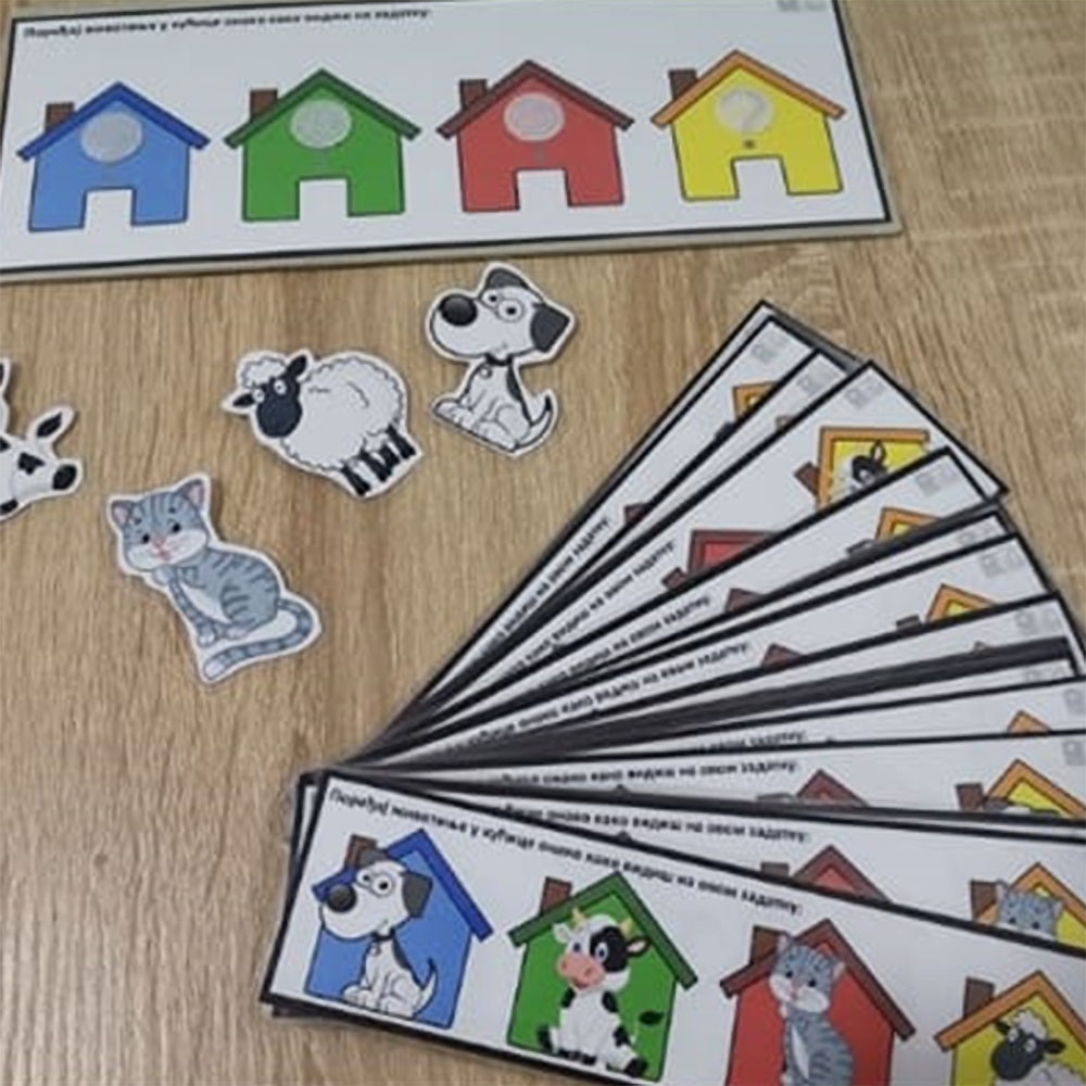 Plastificirani šablon, ojačan lepenkom, 30 plastificiranih delova na čičak (zid, krov, prozor, vrata) i 28 plastificiranih kartica – zadataka.