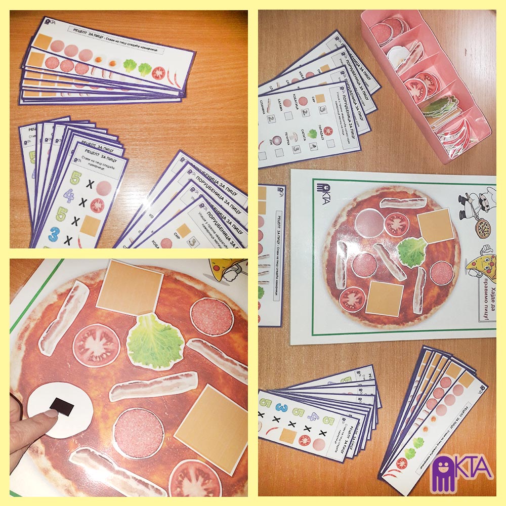 Šablon A3 formata, ojačan lepenkom, plastificirane kartice – namirnice (50kom), zadaci – vizuelni niz (12kom), zadaci brojčani (9kom), prazni šabloni za pravljenje pizze po svom izboru (4kom).