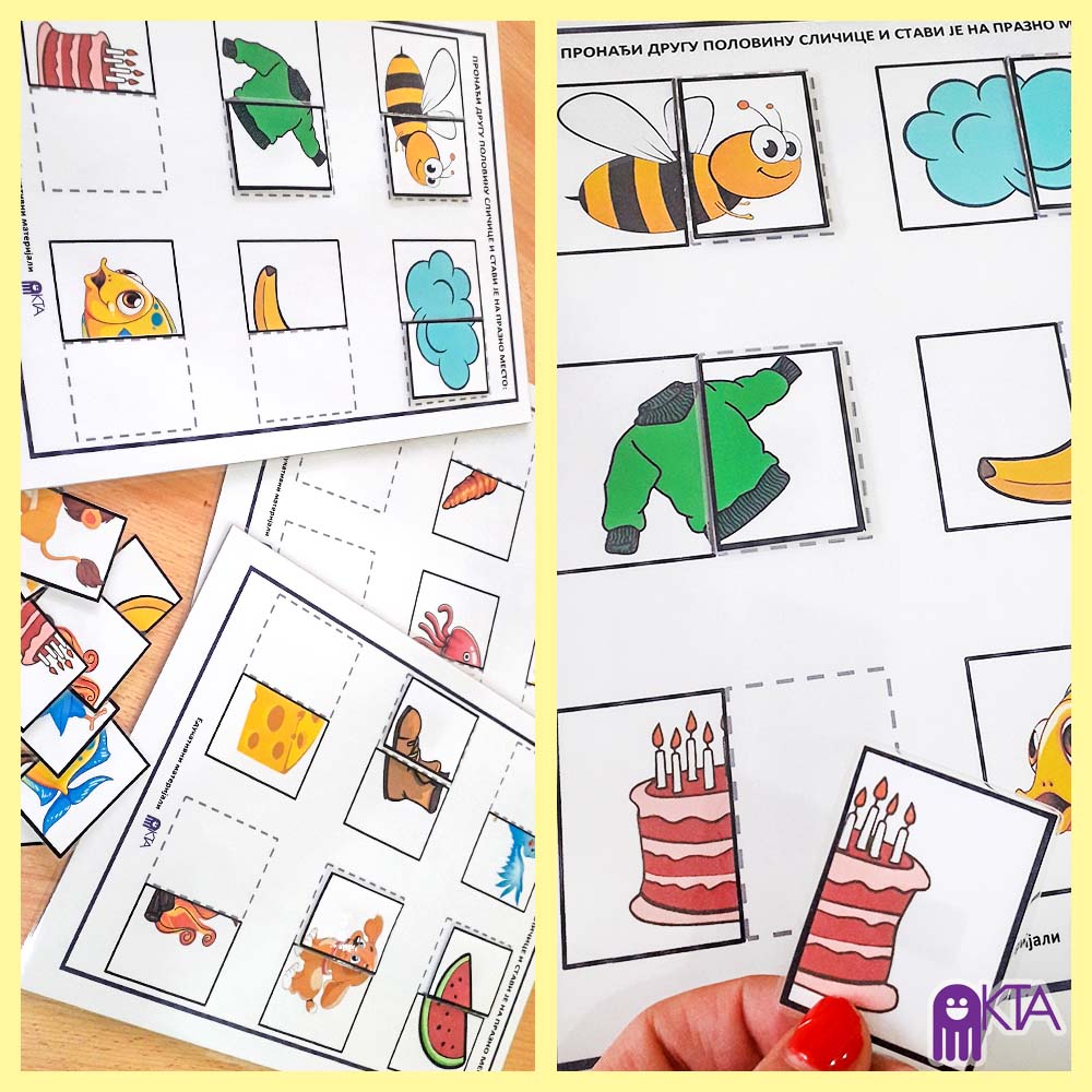 Vizuelno pretraživanje dela slike, sklapanje celine iz dva dela, bogaćenje pasivnog i aktivnog rečnika. Opširnije