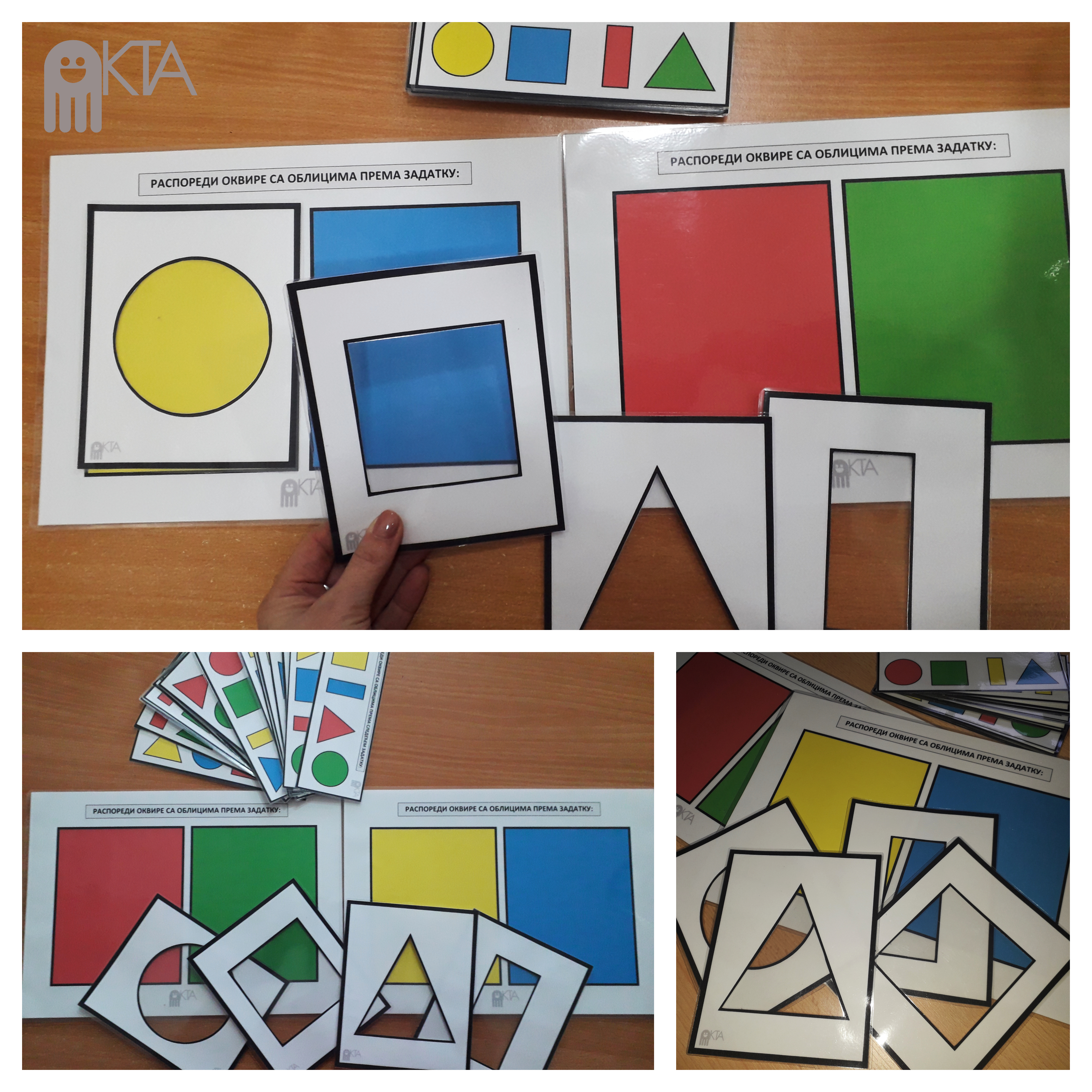 2 plastificirana šablona, ojačana lepenkom, 4 prozorčića osnovnih oblika, 16 plastificiranih kartica – zadataka.