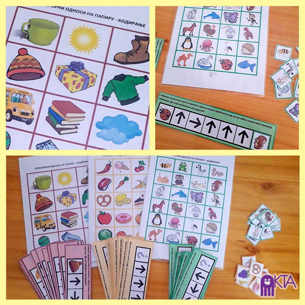 Usvajanje prostorne orijentacije na papiru, uz vizuelni podsticaj – gore, dole, levo, desno, gore/levo, dole/desno, u sredini/gore itd... Opširnije